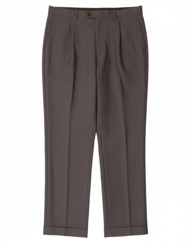 - AI Description: These Ralph Lauren men's suit trousers are crafted from fine grey 100% woven wool for a premium feel. They feature a classic straight leg and a comfortable fit, ensuring ease of movement. Pleated fronts and cuffed hems add sophisticated tailoring details. A neat zip closure maintains a clean line. Practical pockets complete this timeless design.