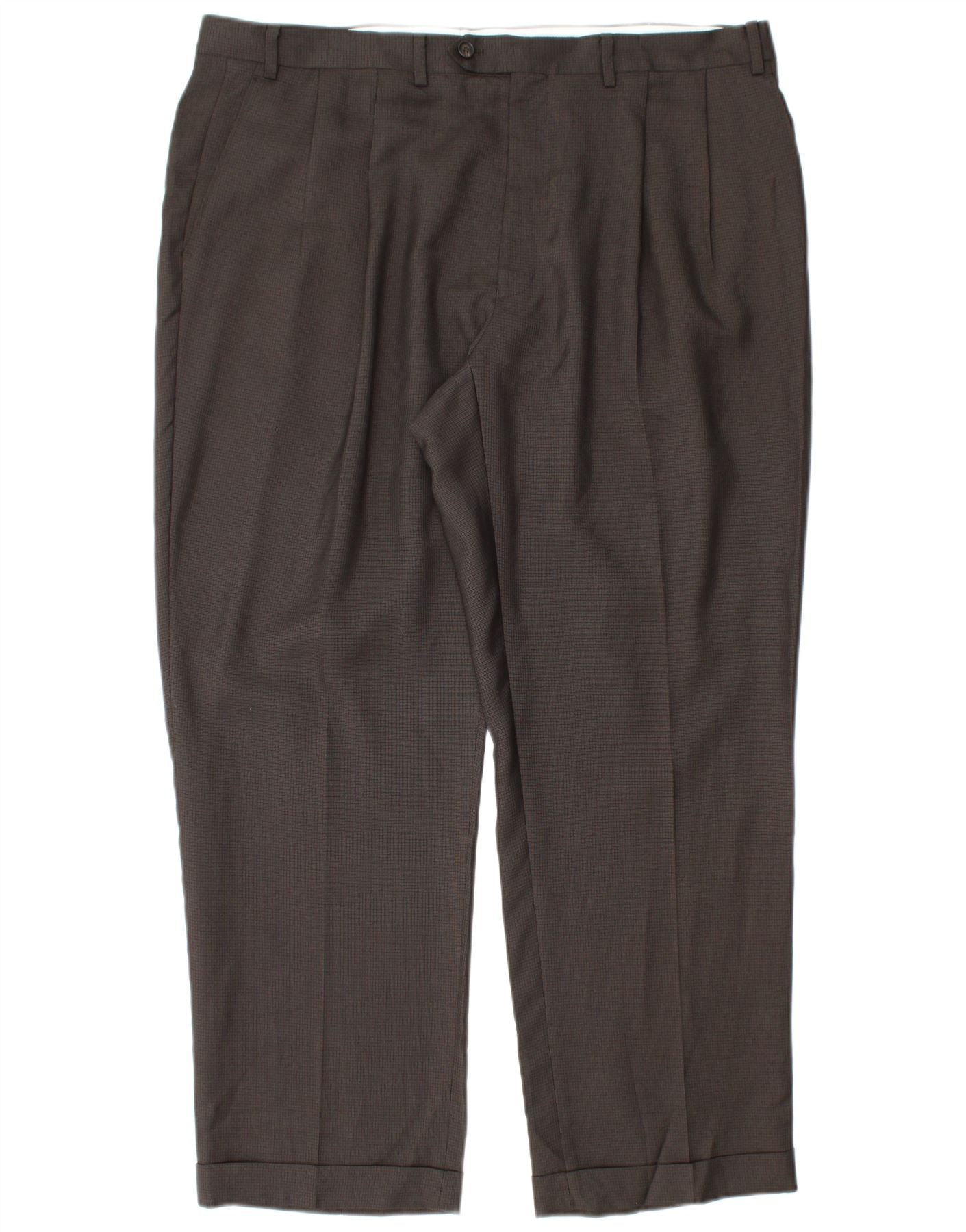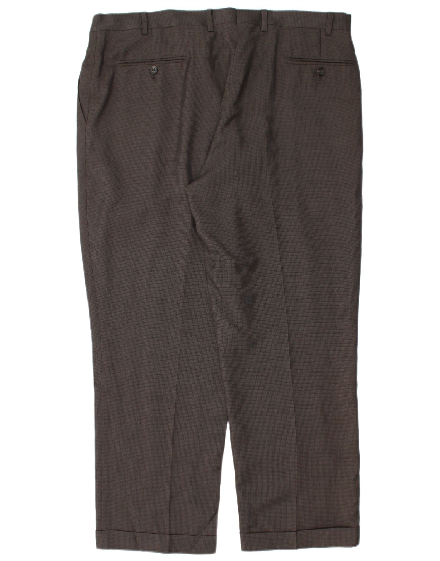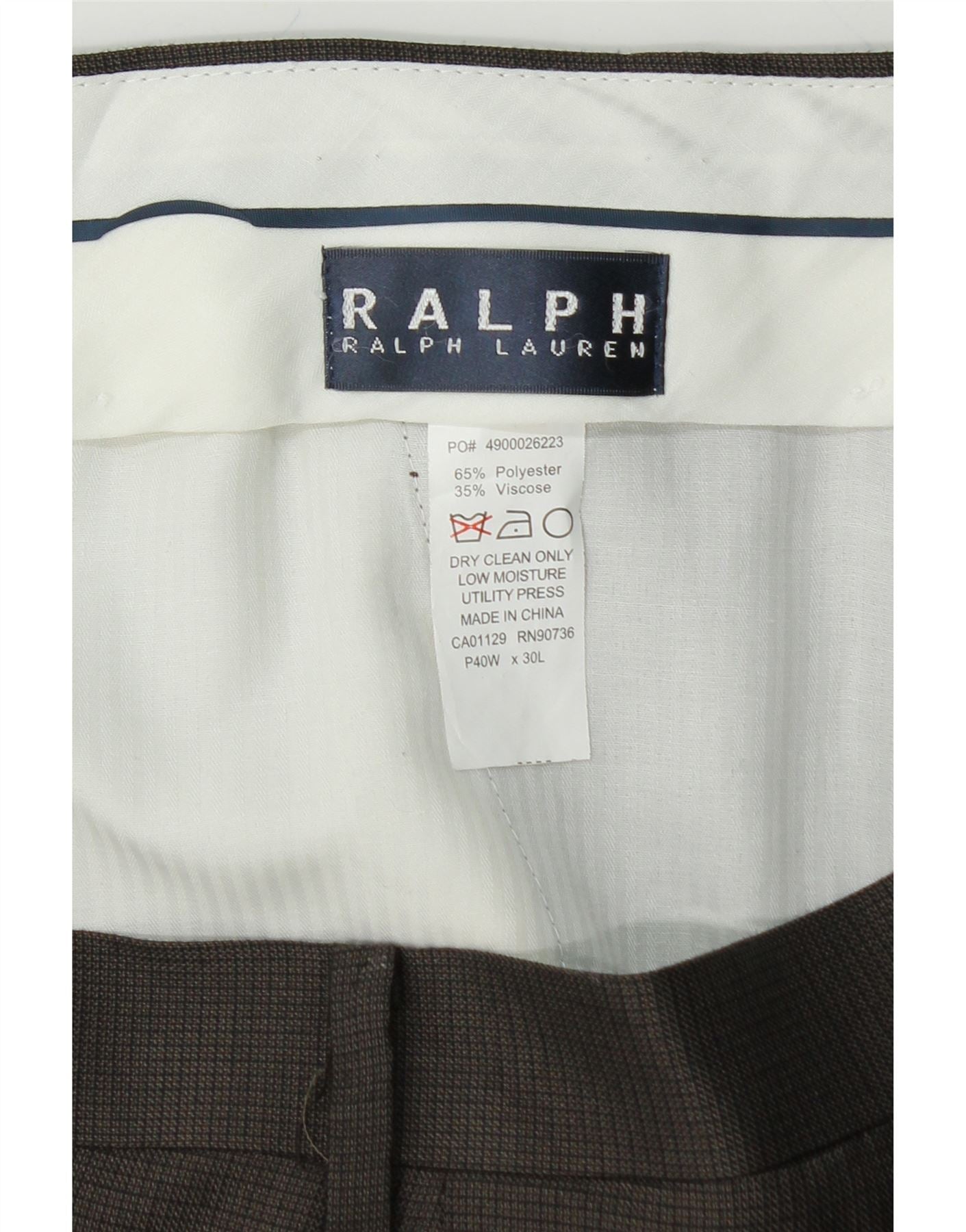- AI Description: These Ralph Lauren men's Suit Trousers are crafted from a brown blended fabric, featuring a subtle pinstripe pattern. The polyester and viscose blend offers a smooth, refined texture. Designed with a tailored fit and regular cut, they ensure a smart silhouette. Pleated detailing at the front adds classic style. A button closure and practical pockets complete this sophisticated pair.