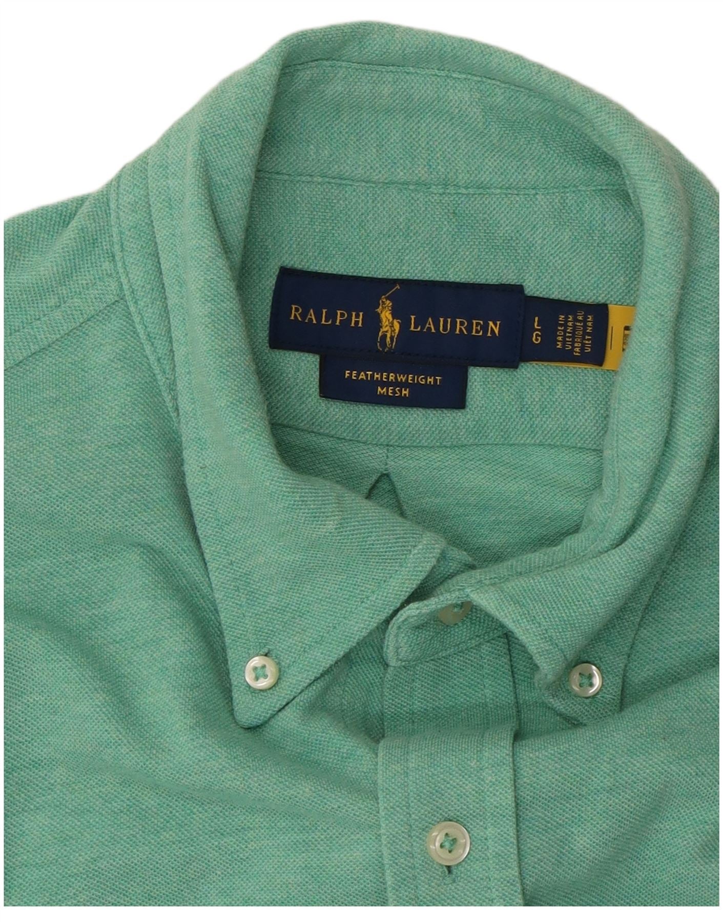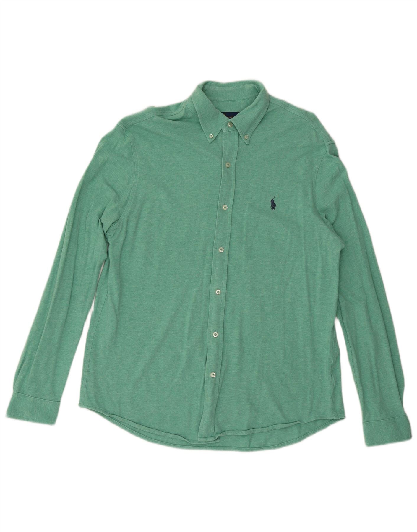 - AI Description: This Polo Ralph Lauren mens shirt is crafted from a lightweight, breathable featherweight mesh fabric in a versatile green hue. It features a classic collared neckline and long sleeves. The full button-up front ensures a neat finish. An embroidered logo accent adds a signature touch. Designed for a regular fit, it offers comfortable, timeless style.