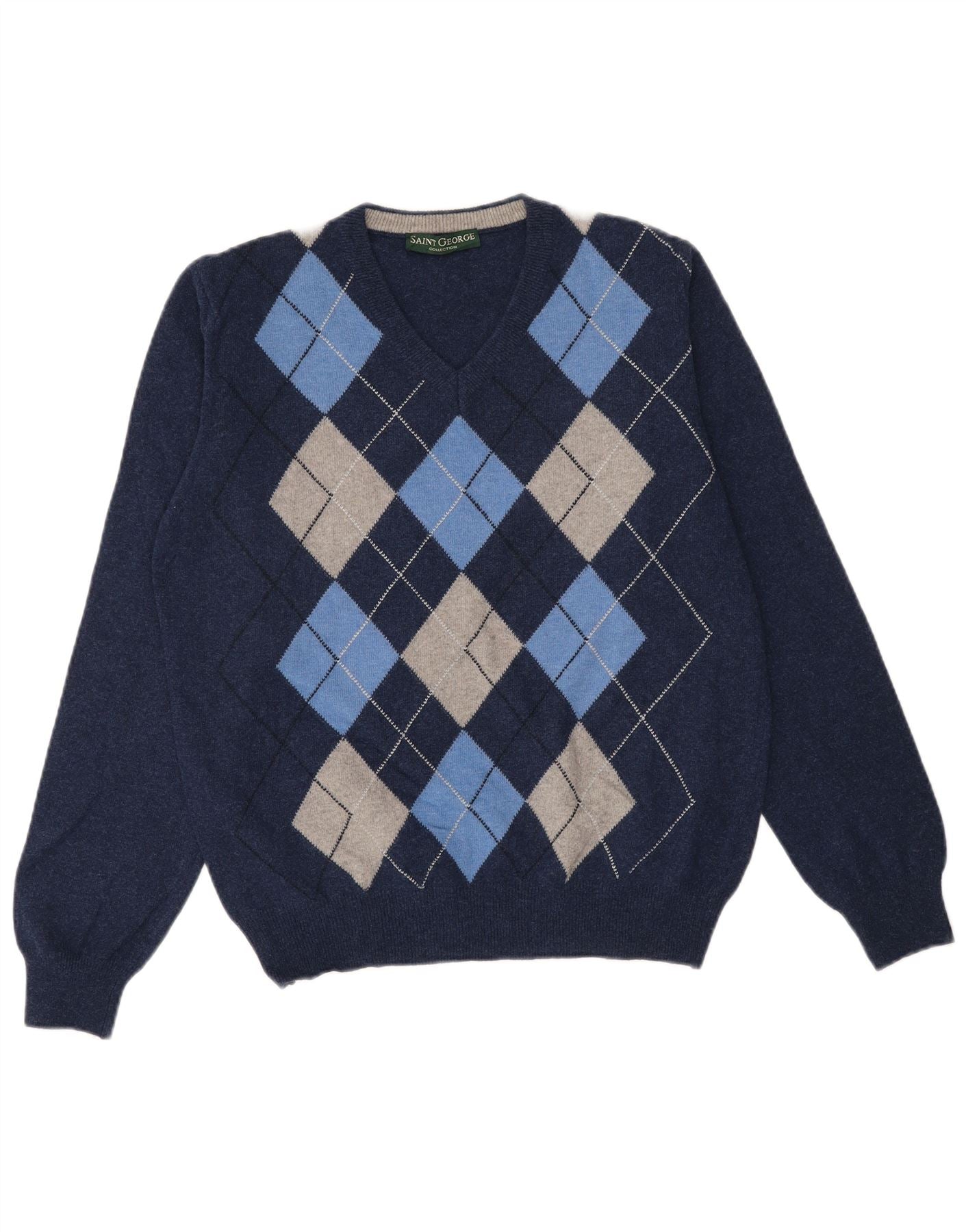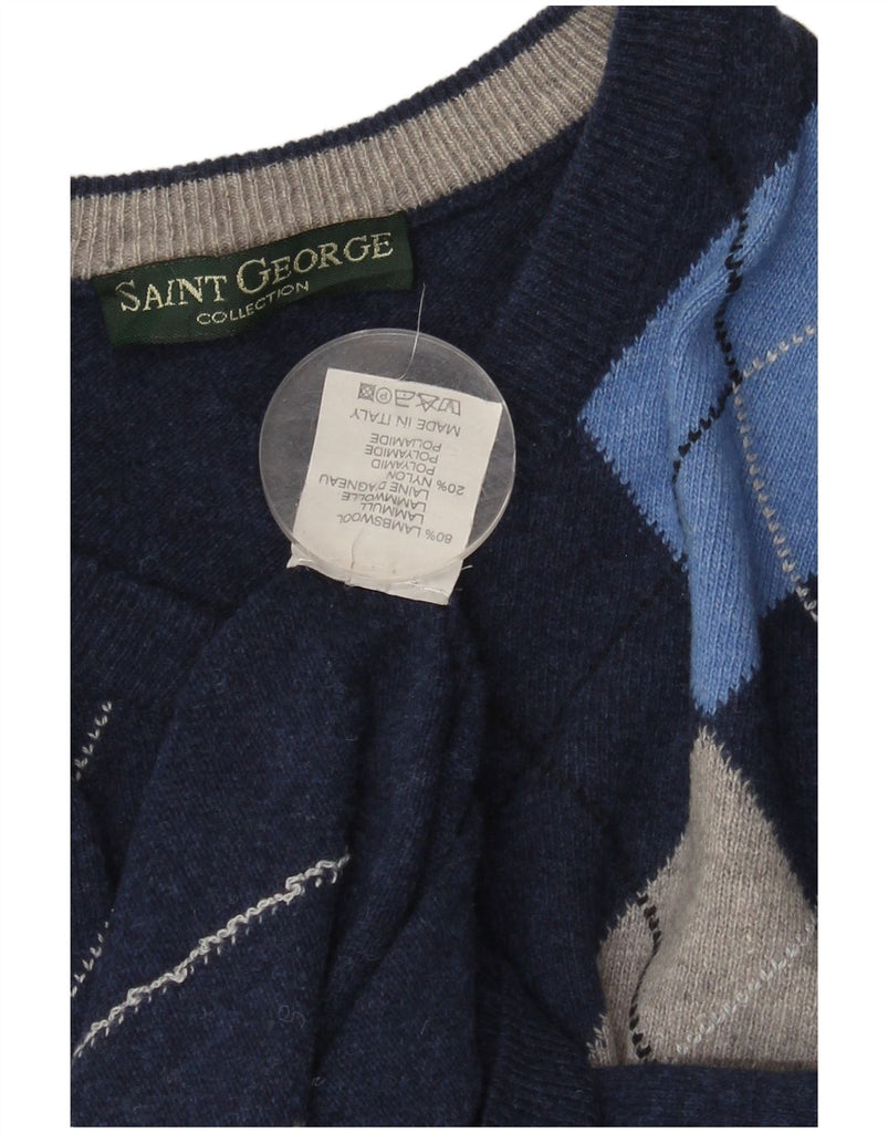 SAINT GEORGE Mens V-Neck Jumper Sweater Medium Navy Blue Argyle/Diamond