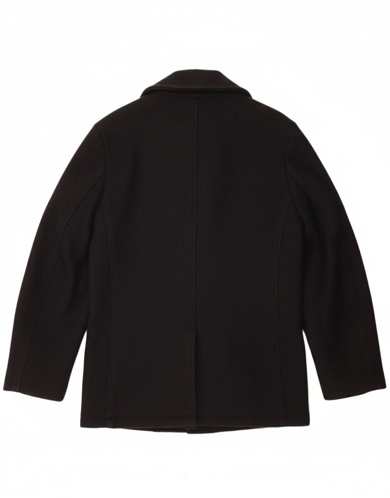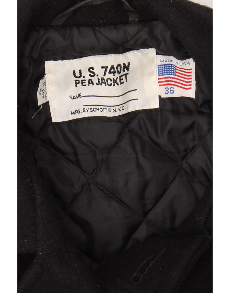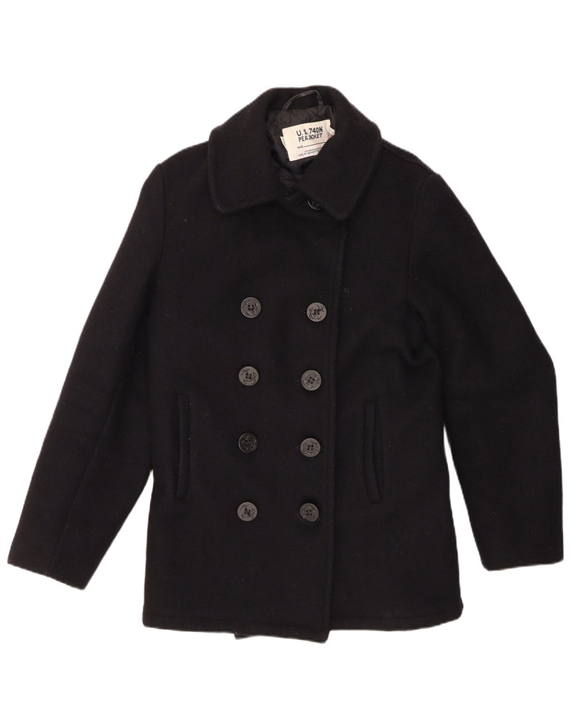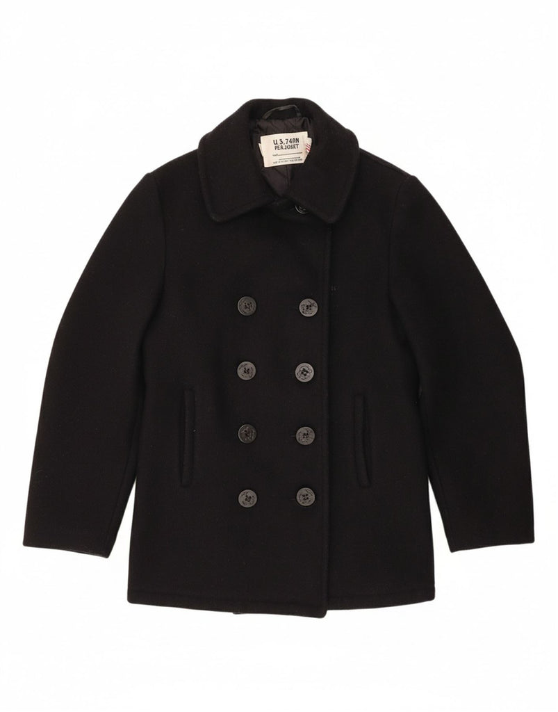 - AI Description: This Schott women's pea coat is crafted from rich, black woven wool. It features a classic collared neckline and a double-breasted front. Tonal button closures add a sophisticated touch. Long sleeves provide ample coverage. The regular fit offers comfort and timeless appeal. Practical pockets complete the design.
