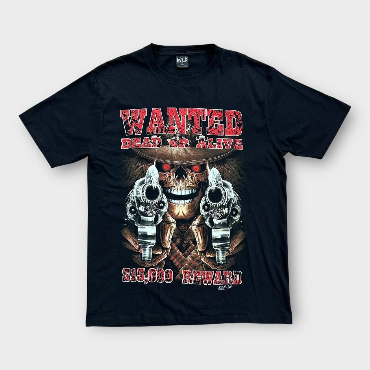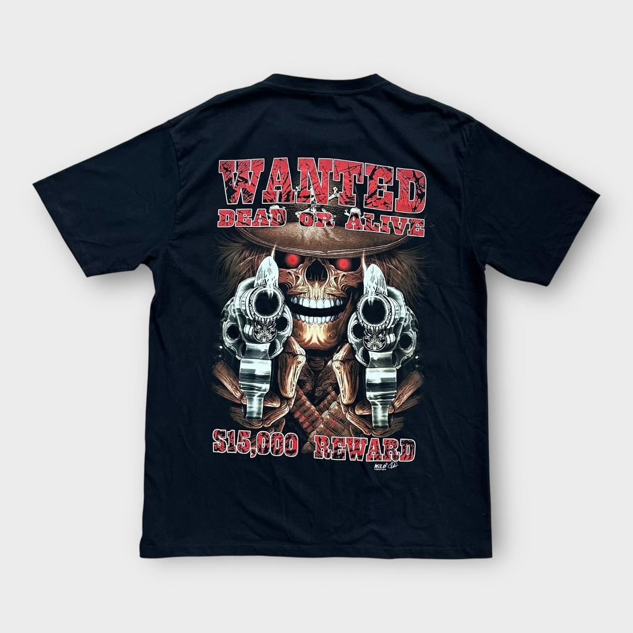 Γραφικό μπλουζάκι κρανίου στις αρχές της δεκαετίας του 2000 "Wanted dead or alive" με στάμπα στο στήθος και την πλάτη σε μια άγρια ετικέτα. Διαθέτει επίσης μεταλλικές λεπτομέρειες στο μπροστινό μέρος
