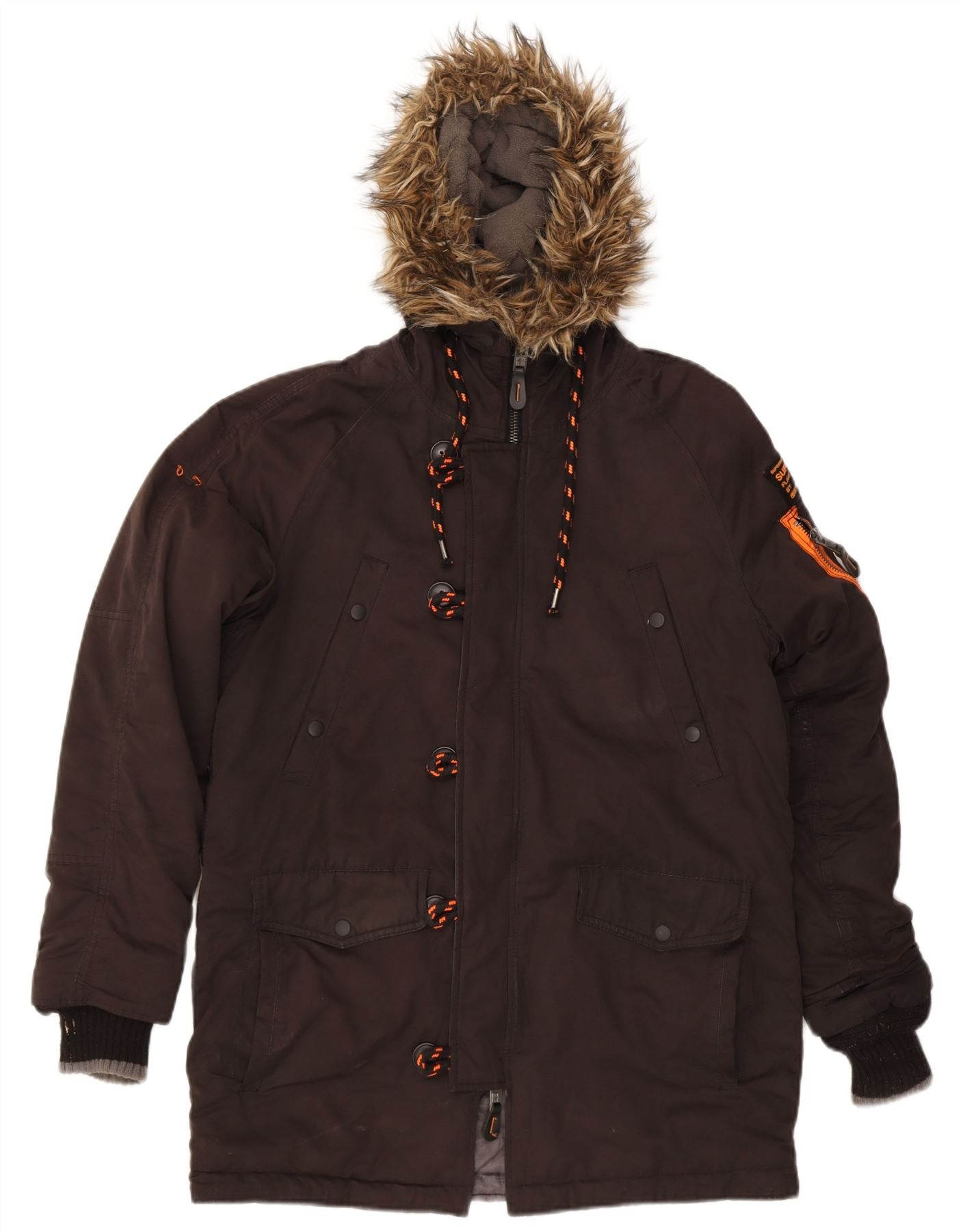 - AI Description: This Superdry mens Parka Jacket is crafted from black microfibre, offering a padded, insulated feel. It features a regular fit and a high neck for warmth. Long sleeves provide full coverage. A zip closure secures the front. The hooded design includes a fur trim accent. Practical pockets and adjustable elements enhance functionality, making it ideal for winter.