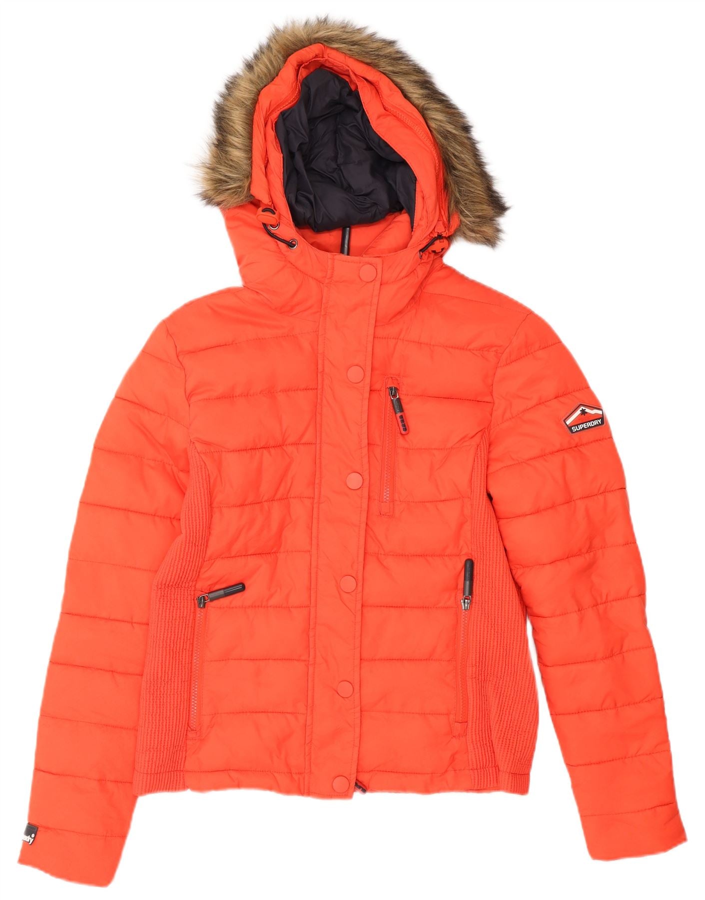 - AI Description: This Superdry womens Padded Jacket is crafted from durable woven nylon, offering a padded and thermal design in a vibrant orange hue. It features a high neck and long sleeves for warmth. The hooded design includes a luxurious faux fur trim. A secure zip closure and zipped pockets add practicality. Its regular fit ensures comfortable wear, perfect for winter.
