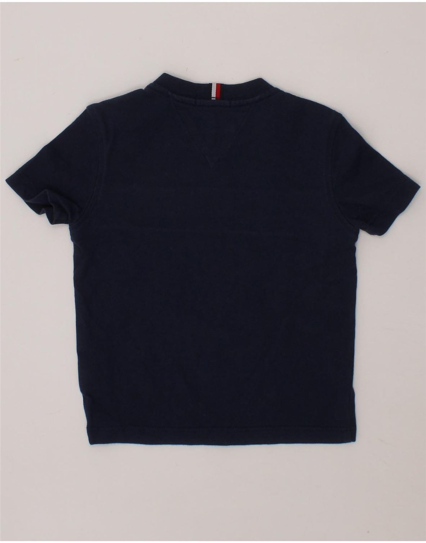 - AI Description: Tommy Hilfiger baby boy's graphic T-shirt in navy blue. Crafted from comfortable knit cotton, this short-sleeve top features a striped pattern, round neck, and a regular fit. The pullover closure and logo accent add to its classic style. Pre-owned in excellent condition with minor fading. Ideal for everyday wear.