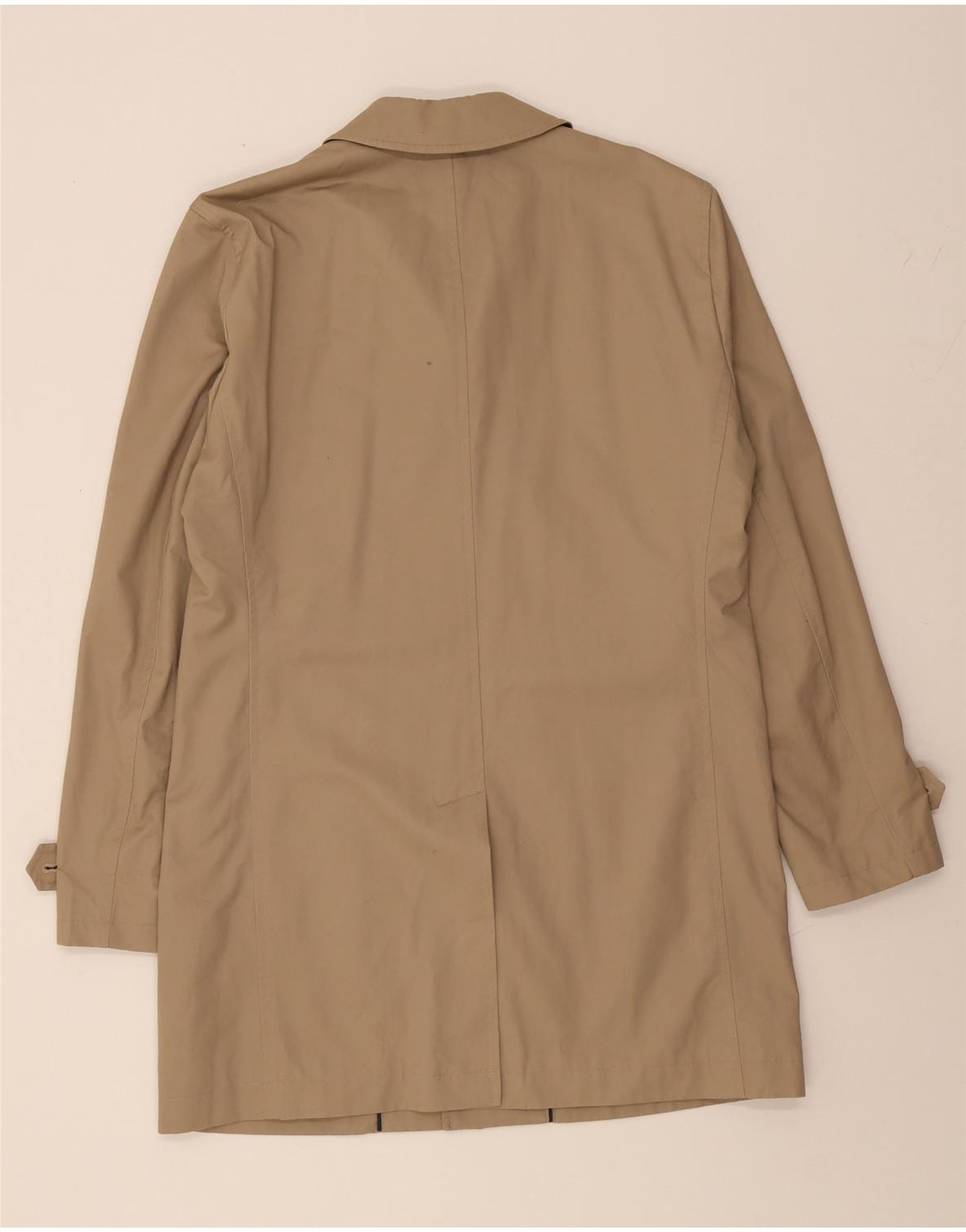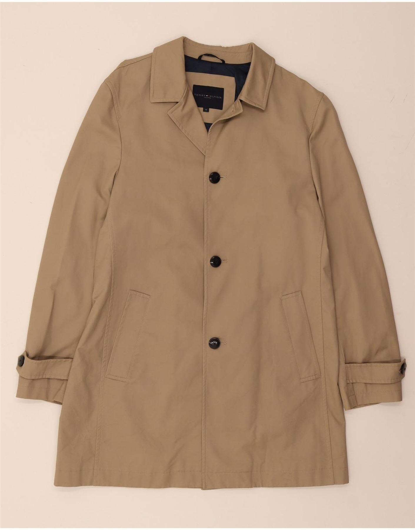 - AI Description: This pre-owned Tommy Hilfiger overcoat is a classic menswear staple. In excellent condition, this beige, woven coat features a regular fit, long sleeves, and a collared neckline. It fastens with buttons and includes practical pockets and a full lining. Accented with buttons, it subtly features a logo. The coat is a size 50, perfect for a smart, timeless look. Recommended Retail Price: £100.00.