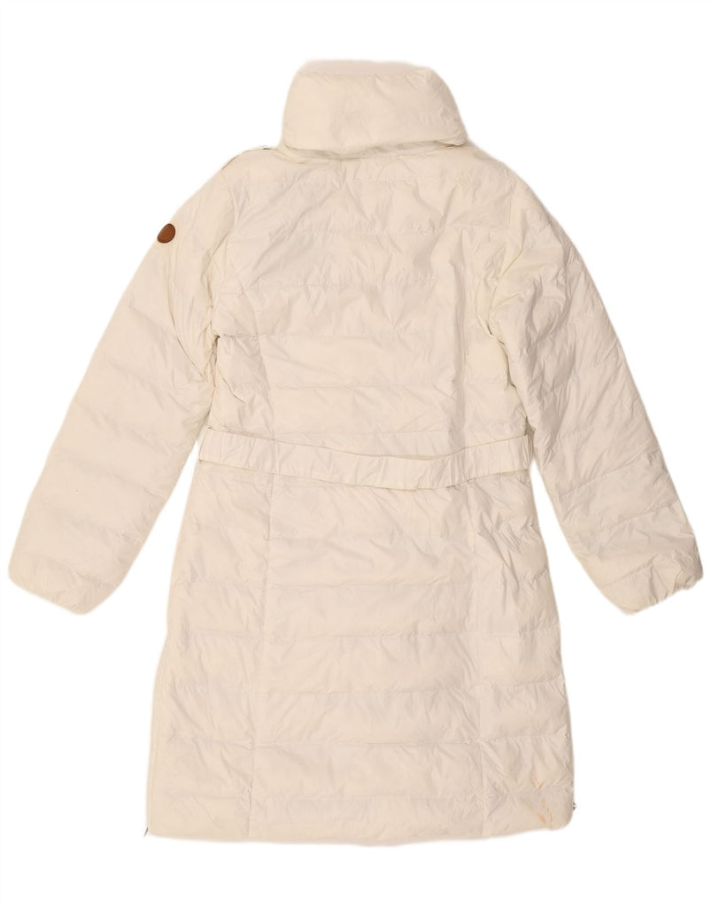 - AI Description: This Tommy Hilfiger womens padded coat is crafted from a down-filled fabric, offering thermal warmth and a soft, padded texture in a sophisticated off-white hue. It features a high neck and long sleeves for ample coverage. A full zip closure is concealed by a button placket. The regular fit ensures comfortable wear. Fully lined, it includes a belted waist with a buckle accent, creating a flattering silhouette.