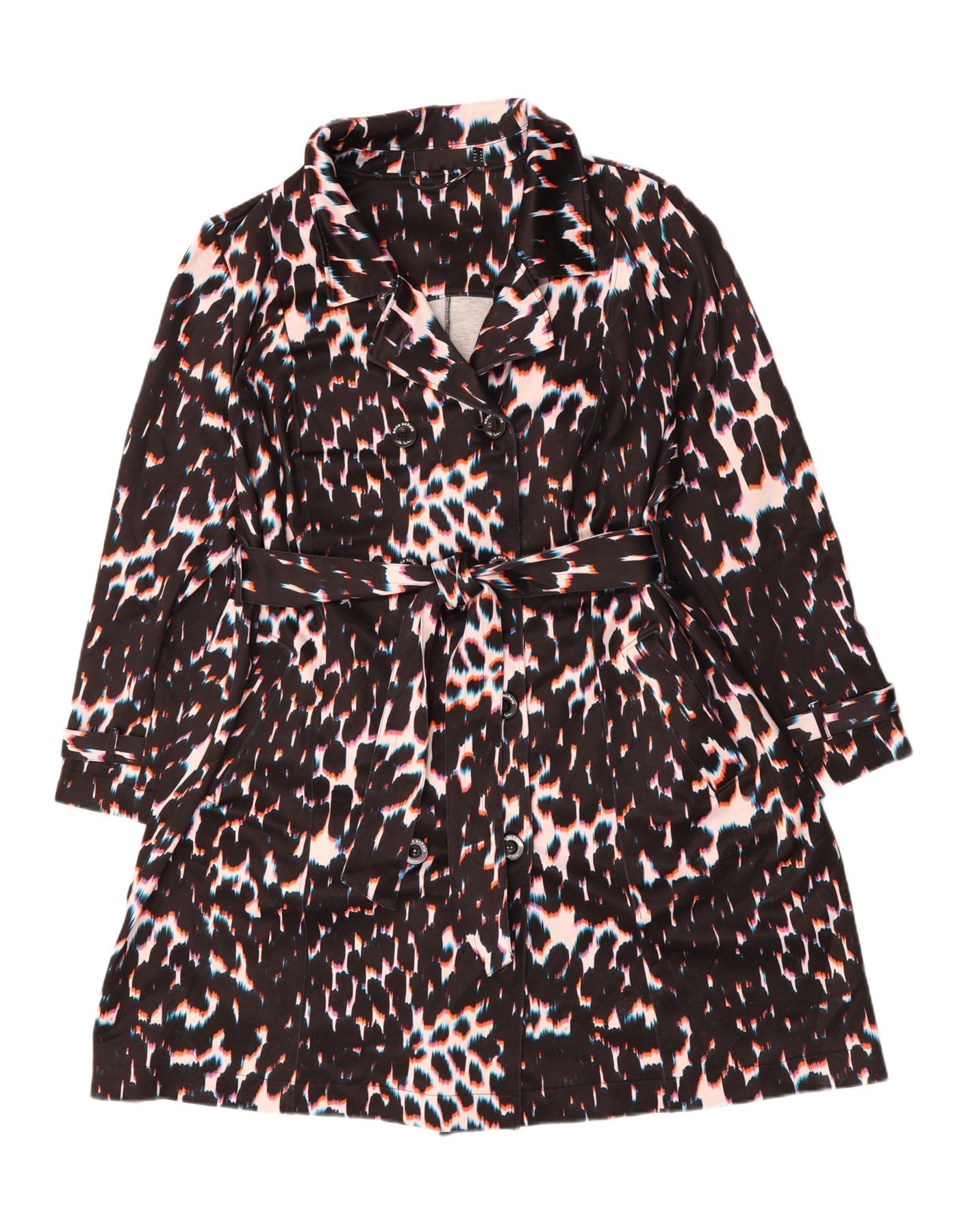 - AI Description: This Vintage womens trench coat is crafted from 100 percent polyester with a woven texture. It features a sophisticated collared neckline and long sleeves, ideal for cooler weather. The double-breasted front fastens securely with buttons, offering a classic silhouette. An eye-catching animal print adds a bold, distinctive touch. A belted waist allows for a defined shape, while functional pockets provide practicality. This regular fit coat combines modern style with timeless appeal.
