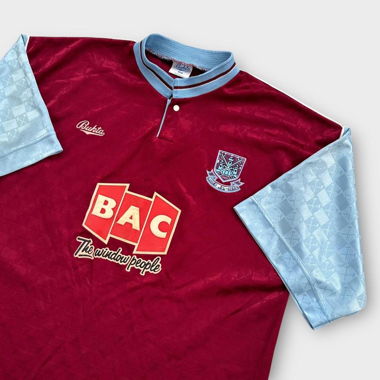 Vintage εντός έδρας ποδοσφαιρική μπλούζα της Γουέστ Χαμ Γιουνάιτεντ από τη σεζόν 1990/1991 από την Bukta με λογότυπα και χορηγό στο στήθος