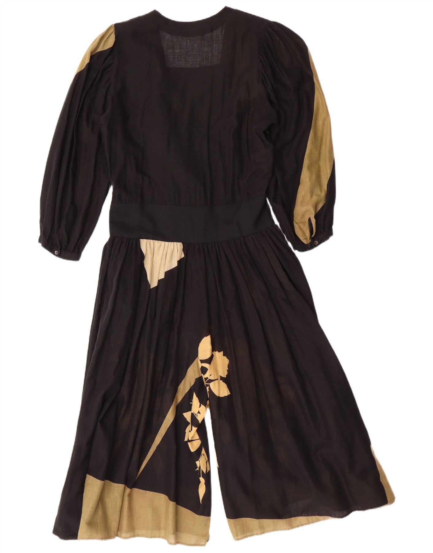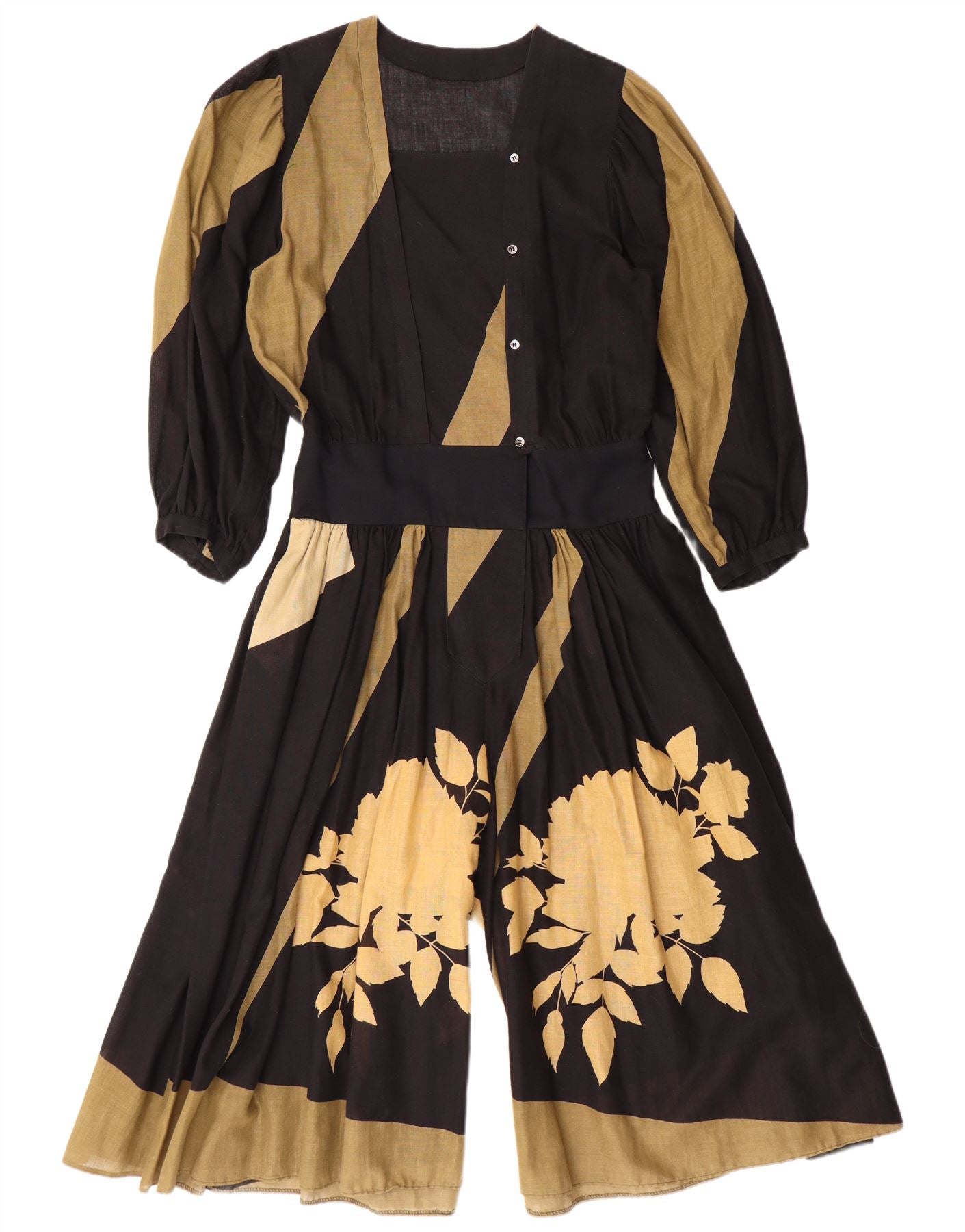 - AI Description: This Vintage womens jumpsuit is crafted from a woven fabric, offering a relaxed, loose fit. A striking floral and abstract pattern adorns the black base. It features a flattering V-neckline and 3/4 sleeves. The design includes a button closure and is belted for waist definition. Cuffed details complete this retro-inspired piece, blending comfort with distinctive style.