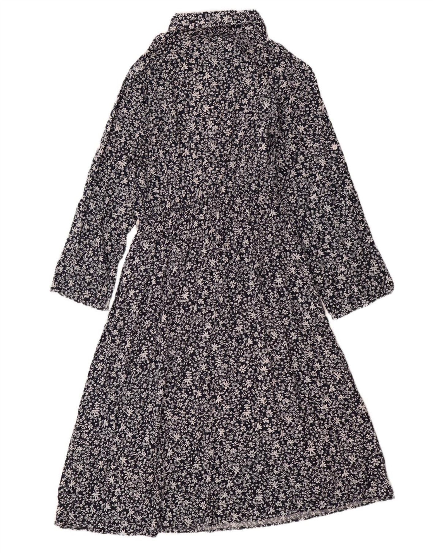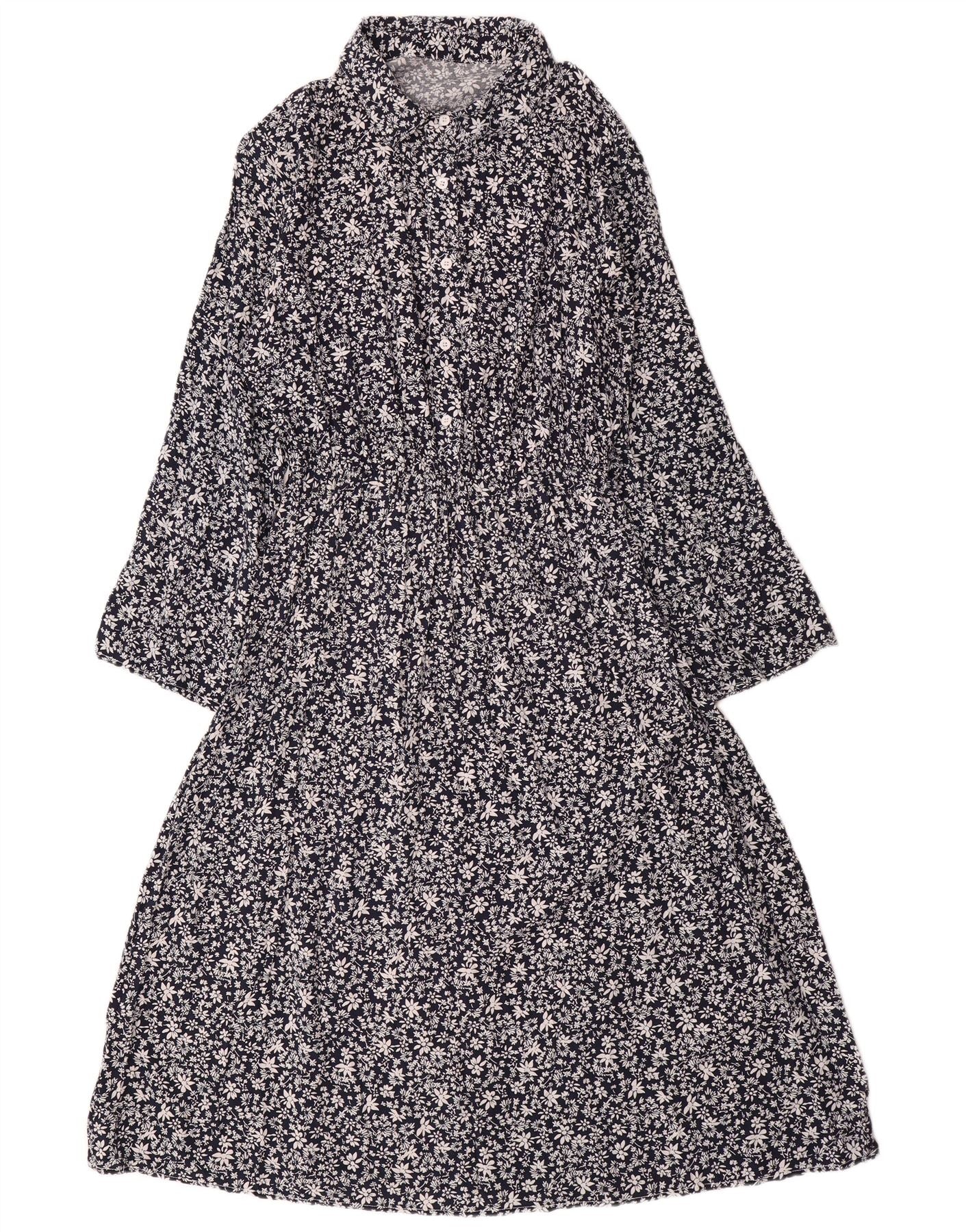 VINTAGE Γυναικείο μακρυμάνικο μάξι φόρεμα UK 14 Μεγάλο μπλε ναυτικό φλοράλ βαμβακερό