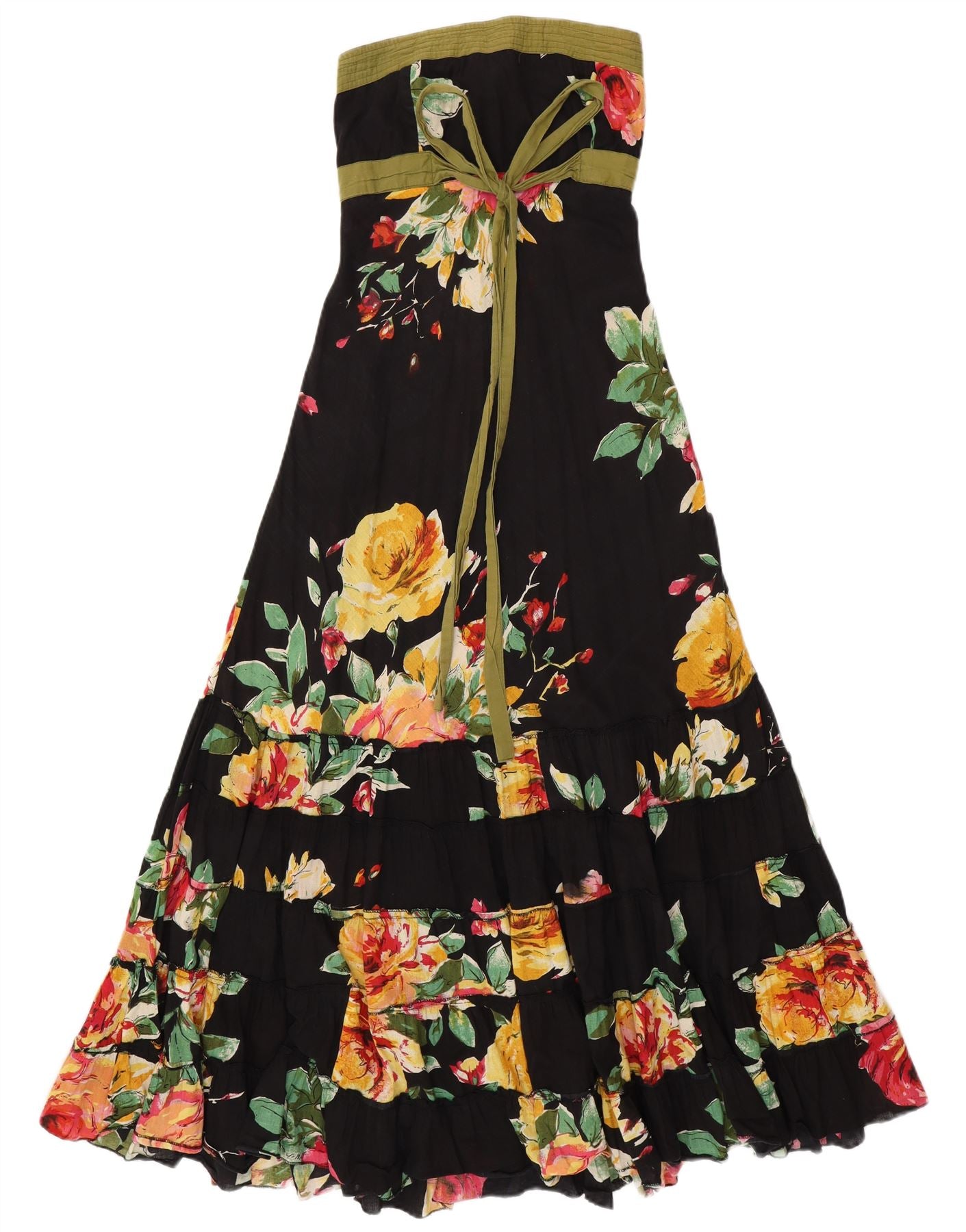 VINTAGE Γυναικείο Maxi Στράπλες Φόρεμα UK 14 Μεσαίο μαύρο φλοράλ βαμβακερό