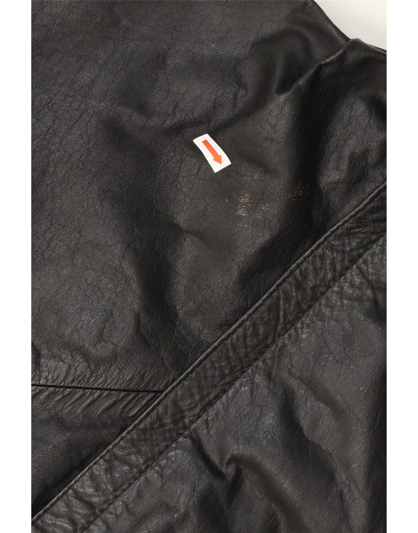 • AI Description: This is a vintage women's black leather bomber jacket, perfect for a biker style. It features long sleeves, a collared neckline, and a regular fit. The jacket is lined and includes pockets and shoulder pads. The closure is snap. Condition is pre-owned fair, with moderate overall wear on the leather and minor stains on the leather surface. There's also a minor tear in the inner lining.