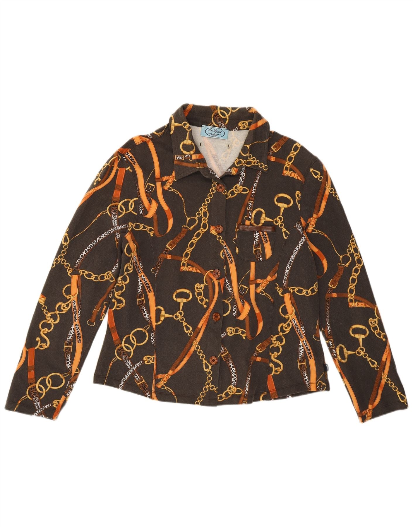 - Περιγραφή AI: Αυτό το γυναικείο μπλουζάκι με γιακά In Sport είναι φτιαγμένο από απαλό, ελαστικό βαμβακερό ζέρσεϊ ελαστάν. Διαθέτει εντυπωσιακή γραφική στάμπα από χρυσές αλυσίδες και καφέ ζώνες σε μαύρη βάση. Η λαιμόκοψη με γιακά και το μπροστινό μέρος με κουμπιά προσφέρουν μια έξυπνη, δομημένη εμφάνιση. Τα μακριά μανίκια και η κανονική εφαρμογή παρέχουν άνετη χρήση. Οι λεπτές τσέπες προσθέτουν πρακτικές λεπτομέρειες σε αυτό το ρετρό εμπνευσμένο σχέδιο.