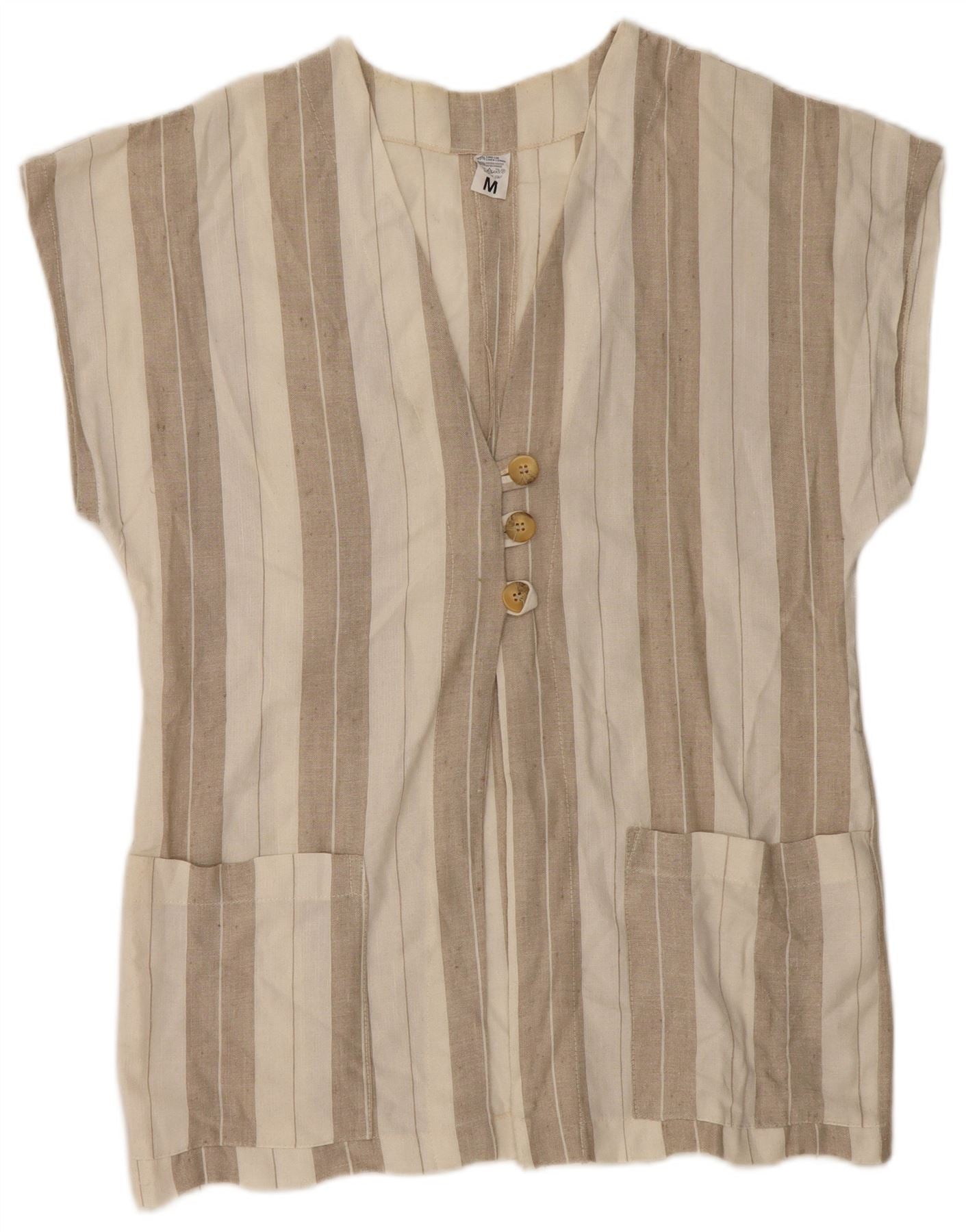 Vintage γυναικείο κοντομάνικο πουκάμισο UK 14 λινό μεσαίο μπεζ ριγέ