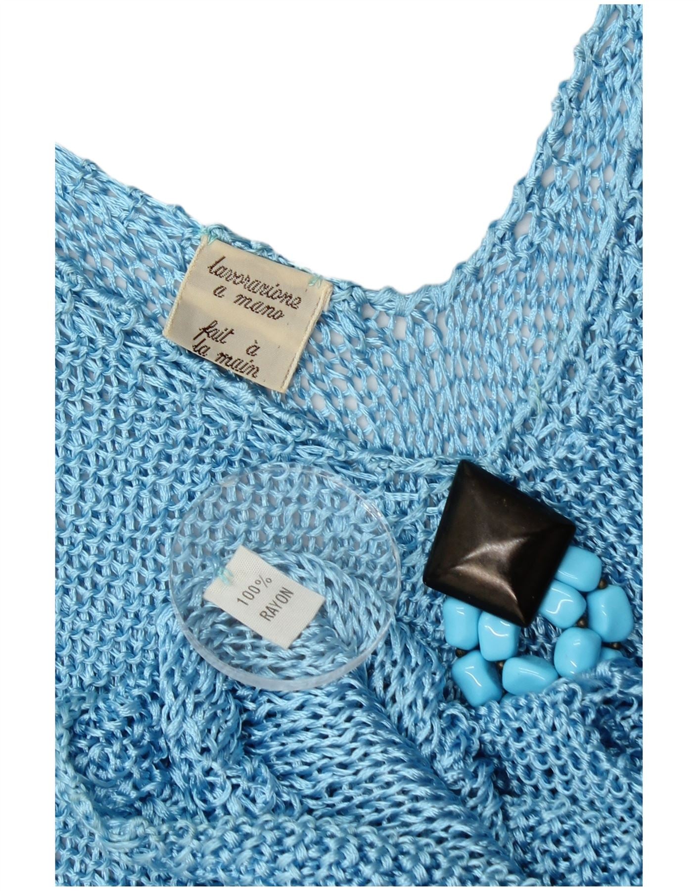 - Περιγραφή AI: Αυτό το Vintage γυναικείο γιλέκο είναι κατασκευασμένο από 100% πλεκτό ρεγιόν, προσφέροντας απαλή, ανάλαφρη αίσθηση σε μια ζωντανή τιρκουάζ απόχρωση. Διαθέτει κλασική λαιμόκοψη σε σχήμα V και αμάνικο σχέδιο. Η κανονική εφαρμογή εξασφαλίζει άνετη χρήση. Ένα αφηρημένο πλεκτό σχέδιο προσθέτει λεπτή υφή στο σώμα. Οι πινελιές με χάντρες κοσμούν τους ώμους και το μπροστινό μέρος, παρέχοντας μοναδικές λεπτομέρειες.