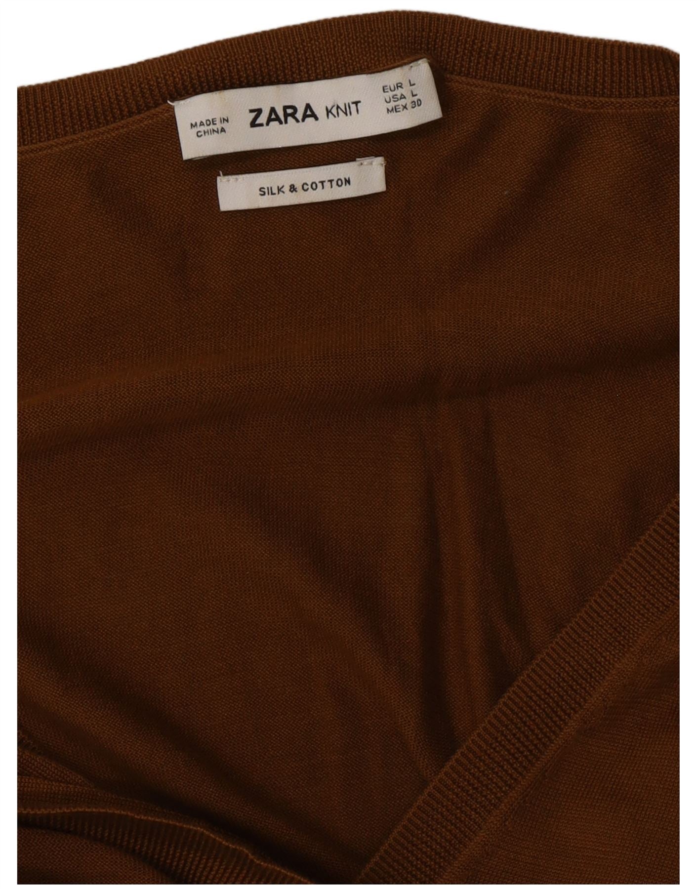 ZARA γυναικείο πουλόβερ με κοντό μανίκι V λαιμόκοψη UK 14 Μεγάλο Καφέ Μεταξωτό